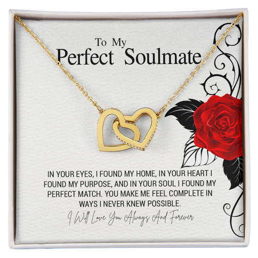 To My Perfect Soulmate...IN YOUR EYES. I FOUNDMY HOME. IN YOUR HEART I FOUND MY PURPOSE,AND IN YOUR SOUL I FOUND MY PERFECT MATCH. YOU MAKE ME FEEL COMPLETE IN WAYS I NEVER KNEW POSSIBLE.